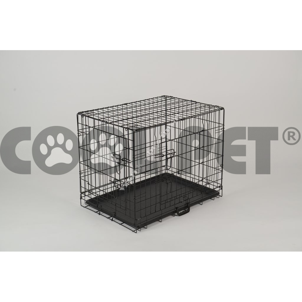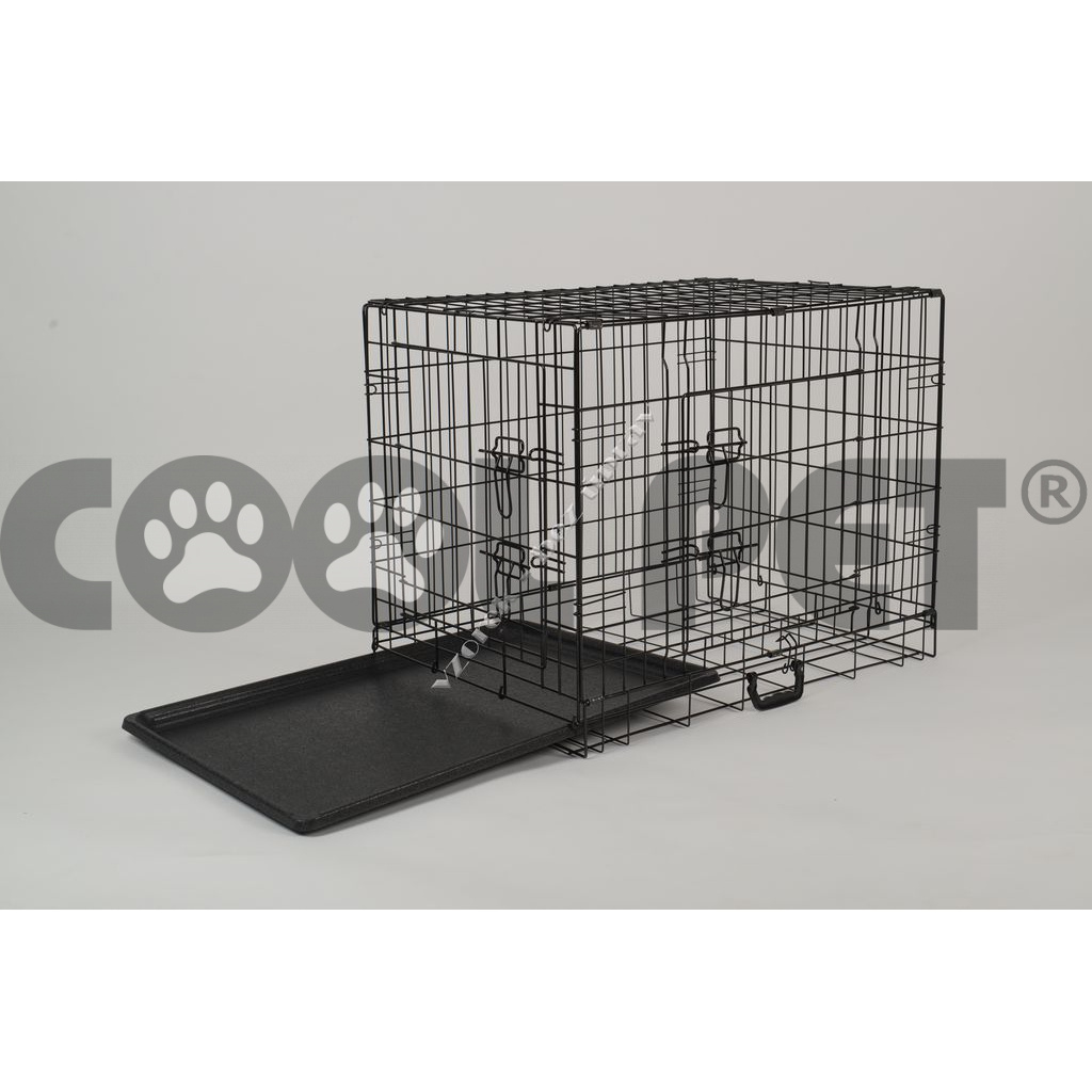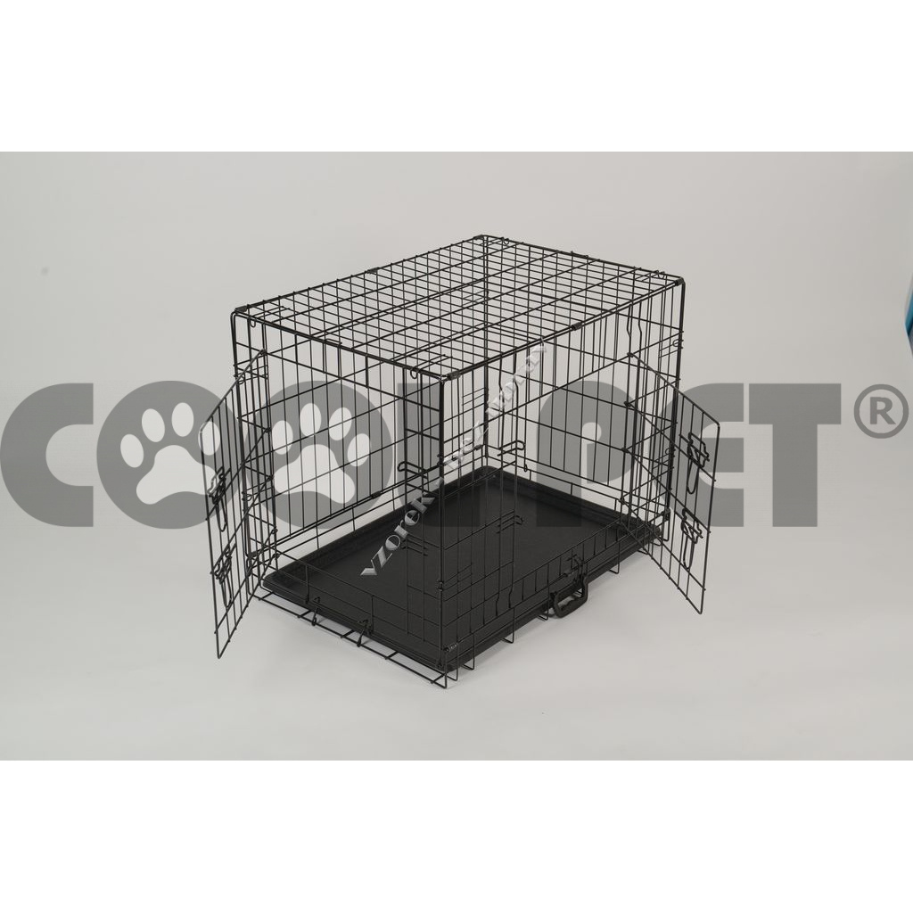 Přepravní či výstavní klec pro psy, železná s černým nátěrem, pevná. Vhodná také jako příležitostní domácí klec. Klec má dva vchody a snadno se složí a odnese.