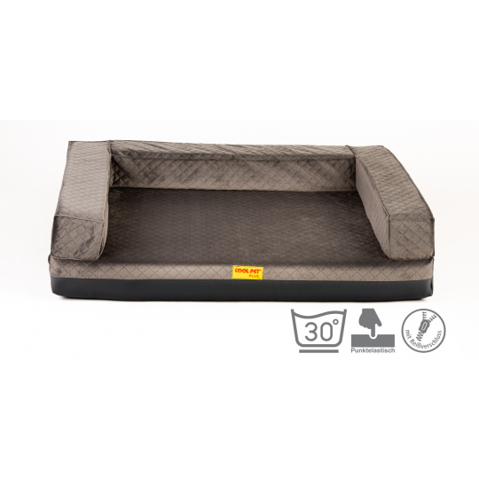 Ortopedický pelíšek, 5 velikostí, s polstrovaným okrajem 10cm vysoká paměťová pěna prošívaný velur popelavě černá/eko kůže černá 70x52cm, vnitřní velikost 50x42cm