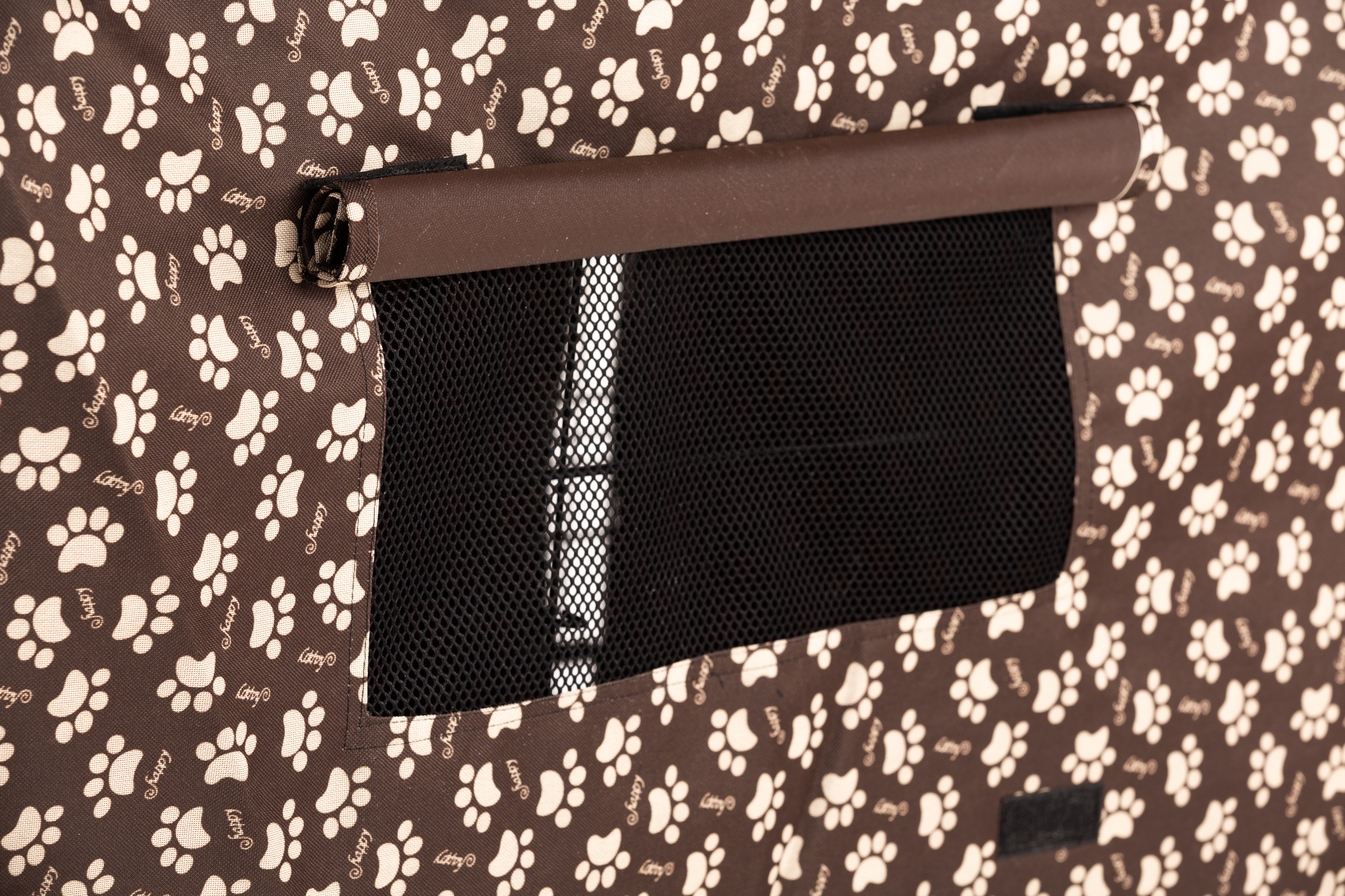 Potah na přepravní klec. Důmyslná konstrukce pro variabilní použití umožňuje zakrytí jednotlivých stran klece - z boku boční kapsa na vše potřebné a na další straně okénko, které je možné otevřít/zavřít. Z pevného, nepromokavého materiálu a okénko na boku, vše z omyvatelného materiálu.