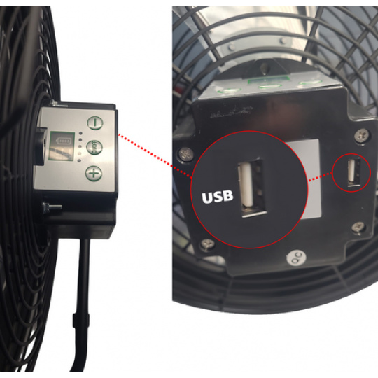 Kromě vlastního nabíjení větráku obsahuje i výstup pro USB, takže si můžete snadno dobít například Váš telefon.