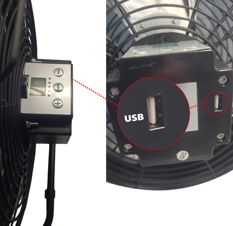 Kromě vlastního nabíjení větráku obsahuje i výstup pro USB, takže si můžete snadno dobít například Váš telefon.