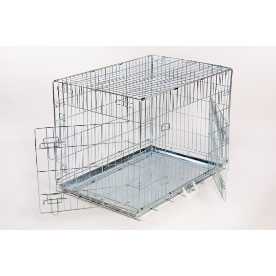 Přepravní či výstavní klec pro psy, železná s černým nátěrem, pevná. Vhodná také jako příležitostní domácí klec. Klec má dva vchody a snadno se složí a odnese.