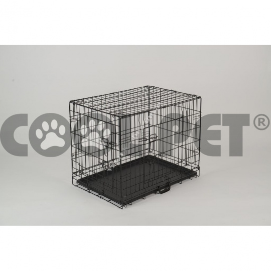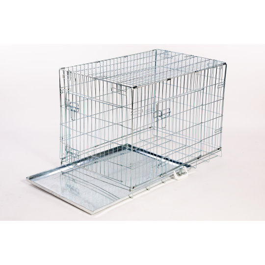 Přepravní či výstavní klec pro psy, ocelová, povrchová úprava: černá prášková barva nebo stříbrný pozinkovaný povrch, pevná, stabilní klec. Vhodná také jako příležitostní domácí klec. Klec má 2 vchody a snadno se složí a odnese.